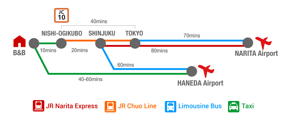 ・From Narita you can also select limousine buses bound for Tokyo St.. It takes about 70 minutes. You shall get on JR-Chuo-line(orange), and get off Nishi-Ogikubo St.(station numbering: JC10). It takes 40 minutes. And come to our B&B by taxi.